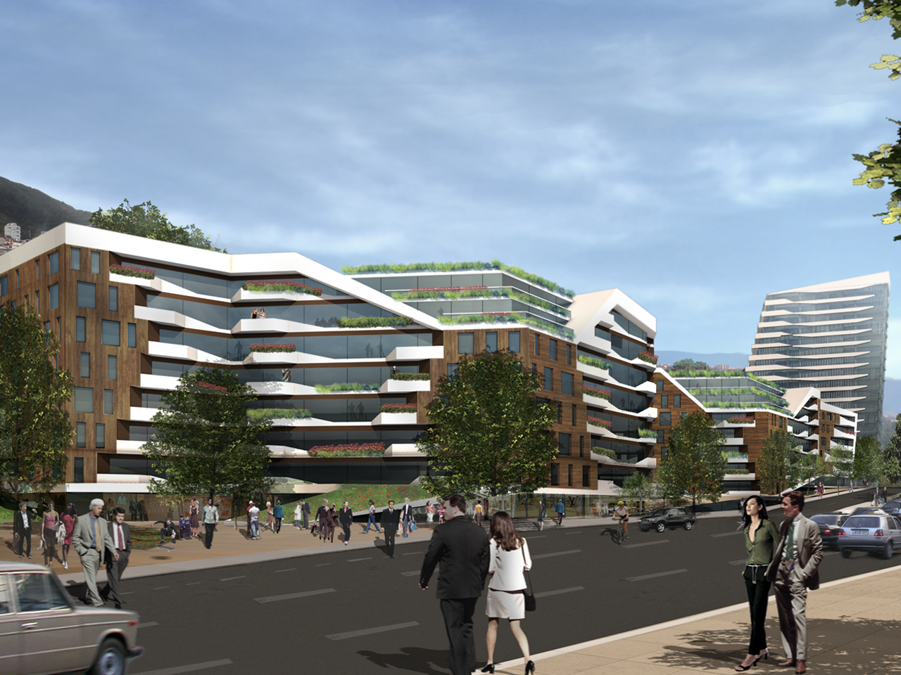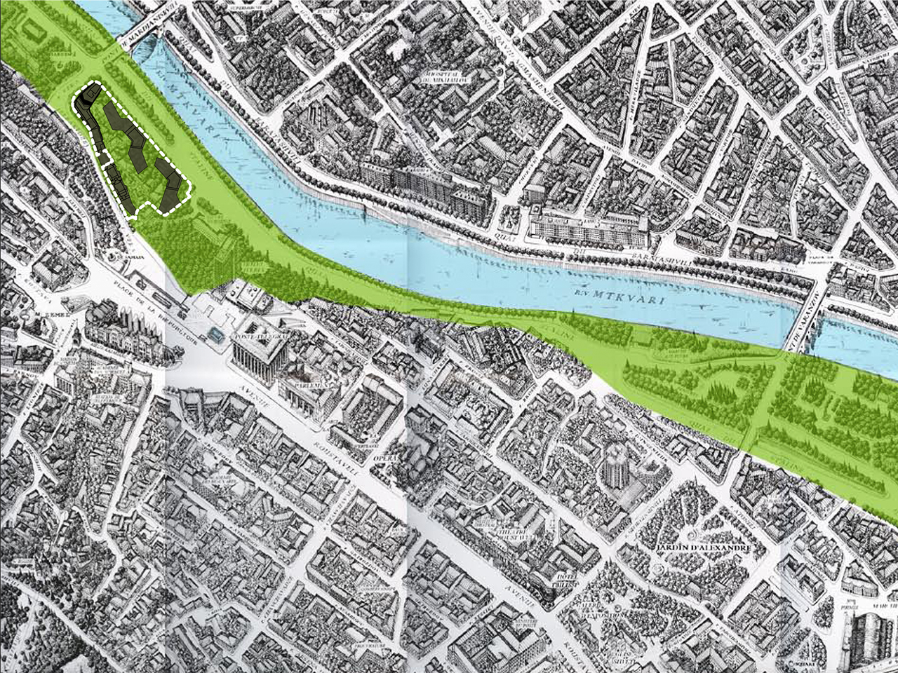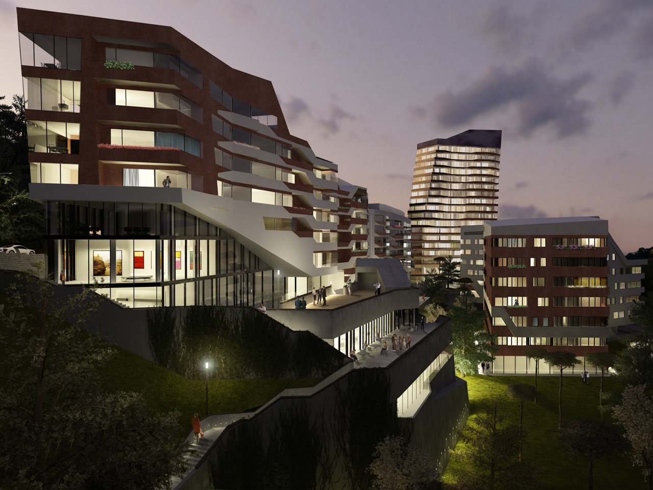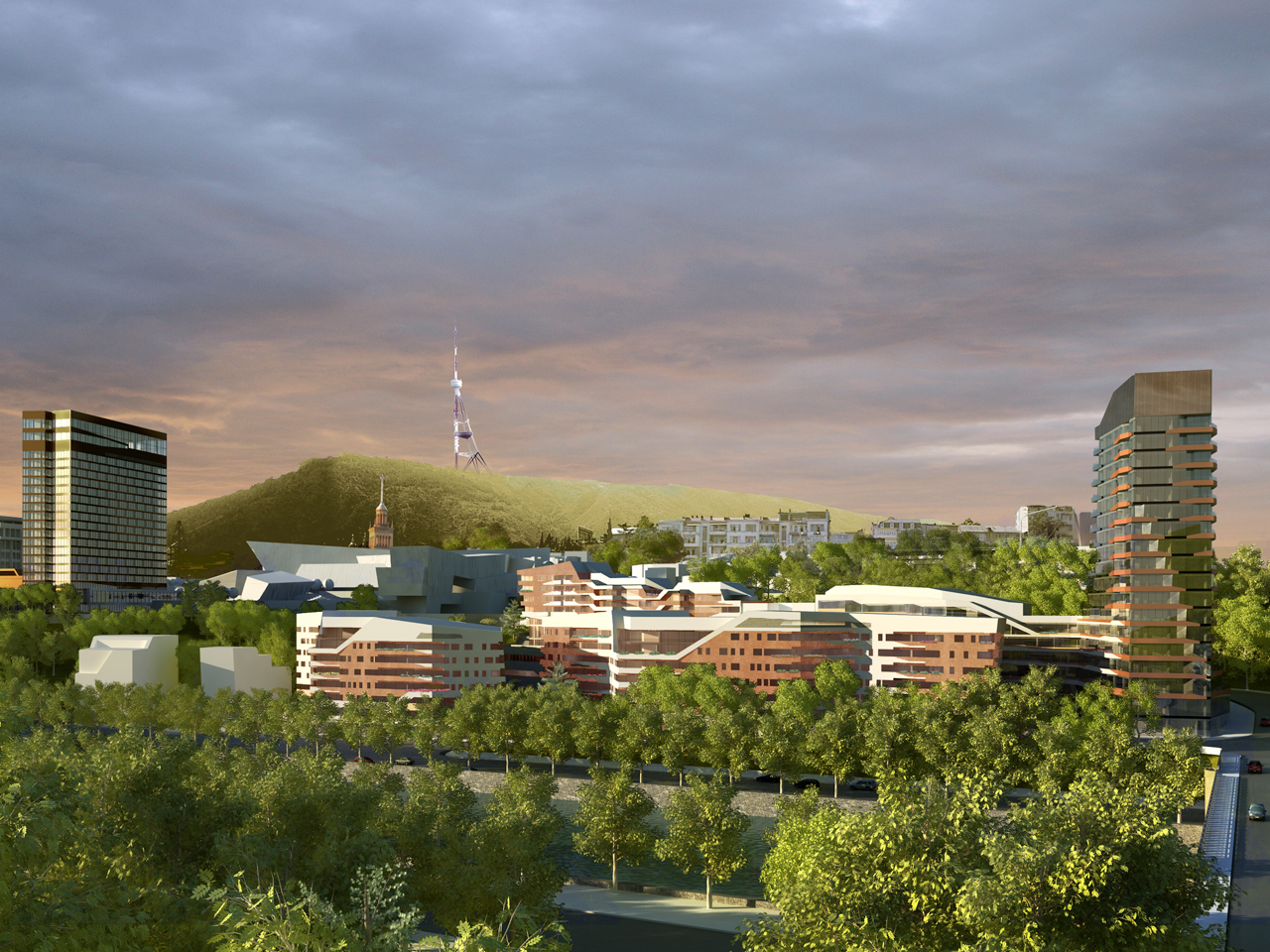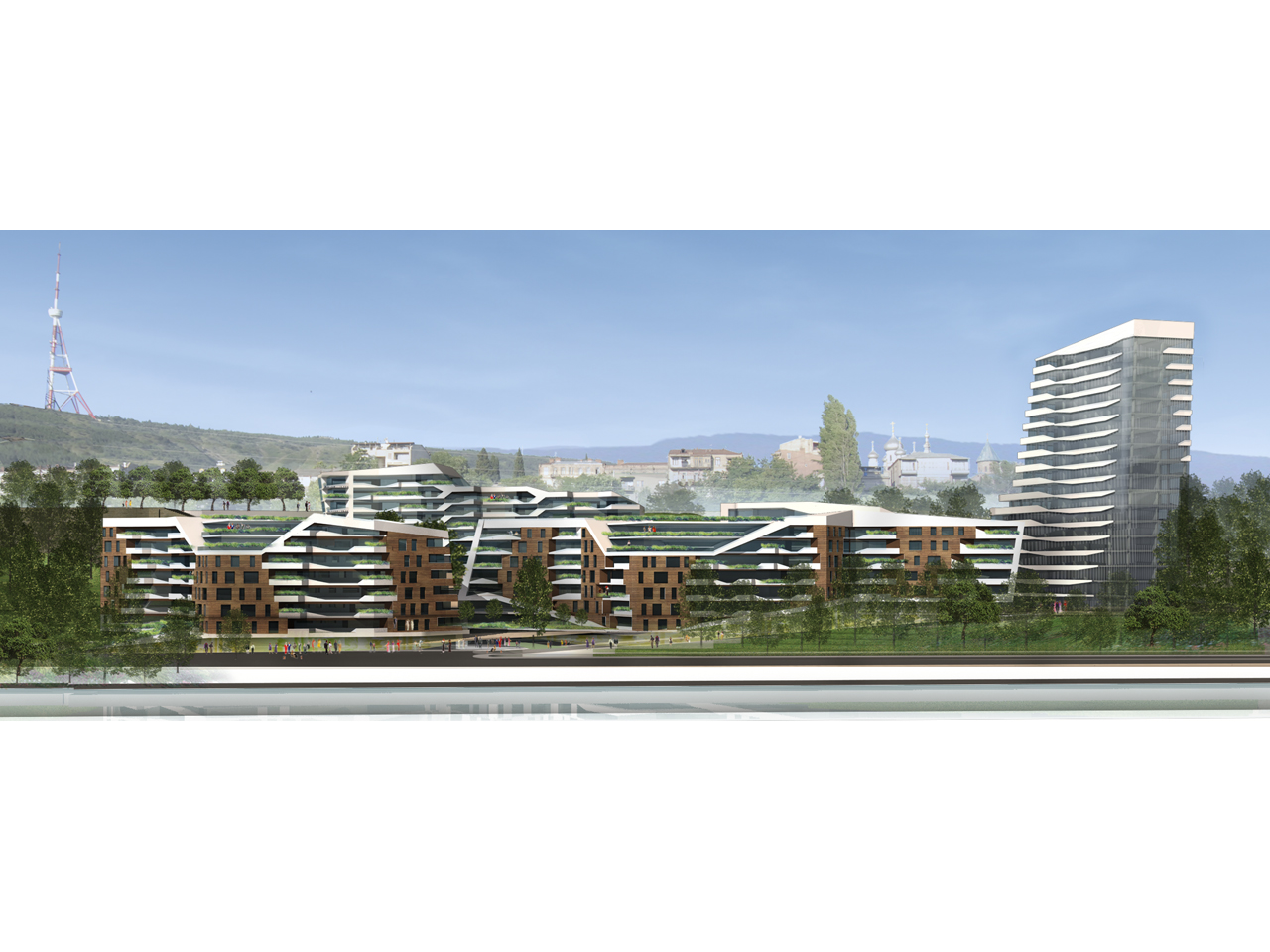 The proposal for a new residential quarter, located along the promenade of the Mtkvari River, below “Rose revolution Square”, the Heart of the city center of Tbilisi, is based on the main characteristics of the site which geologically derived from the historical situation of the estuary of a smaller river into the Mtkvari. The project arranges a new residential quarter in a differentiated mix of 311 apartments of various sizes in combination with high-quality retail areas on the lower floors, a small proportion of office areas as well as underground parking for apartments and shops. The landscaped character of the whole ensemble embeds the architecture in a natural way into the surrounding green zone and provides high-quality living in a green surrounding while being in the heart of the metropolis. The lower part of the development is split up into two meandering pieces thus becoming part of the new park and allowing views into and out of the area. The upper part of the ensemble develops along the slope of the terrain and re-stages the existing ‘Sakanela Road’ in terraced shapes, establishing ‘Sakanela Square’, the quarter’s own plaza, at its lower end. A high rise residential building on this side of the plot provides the new development with a landmark building, marking the end of Galaktioni Bridge. The high-rise provides apartments with stunning views to the lower areas of the city and the snow-capped mountains of the Caucasus in the background. The elegant silhouette of the high-rise swings along the street in a smooth torsion – away from neighbouring buildings and towards the river. The façade design for sakanela urban landscape brings about a subtle diversification of the building volumes, playing on the theme of the urban landscape with its mix of materials, the diversity of balcony and loggia situations and its manifold esthetic appearances.