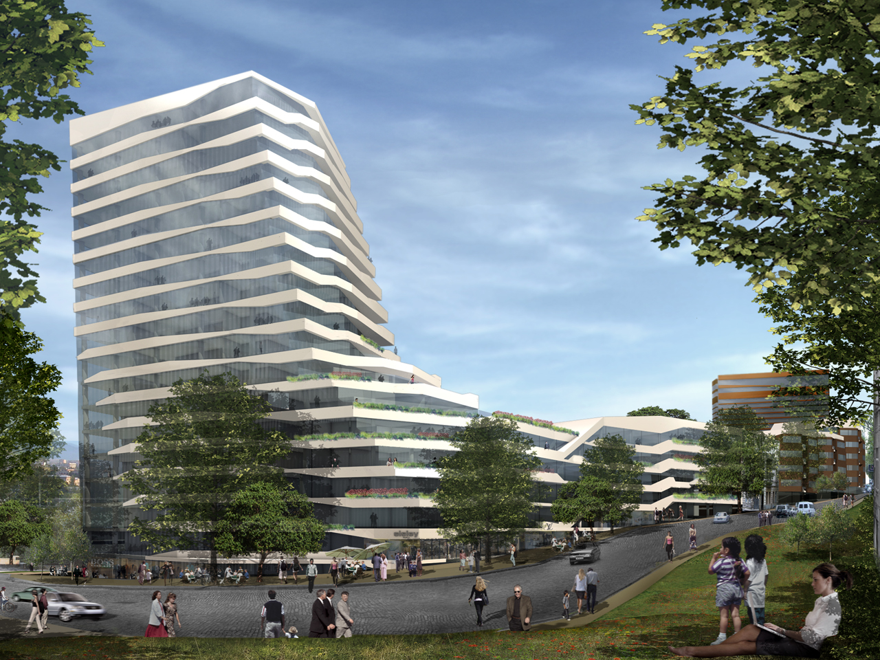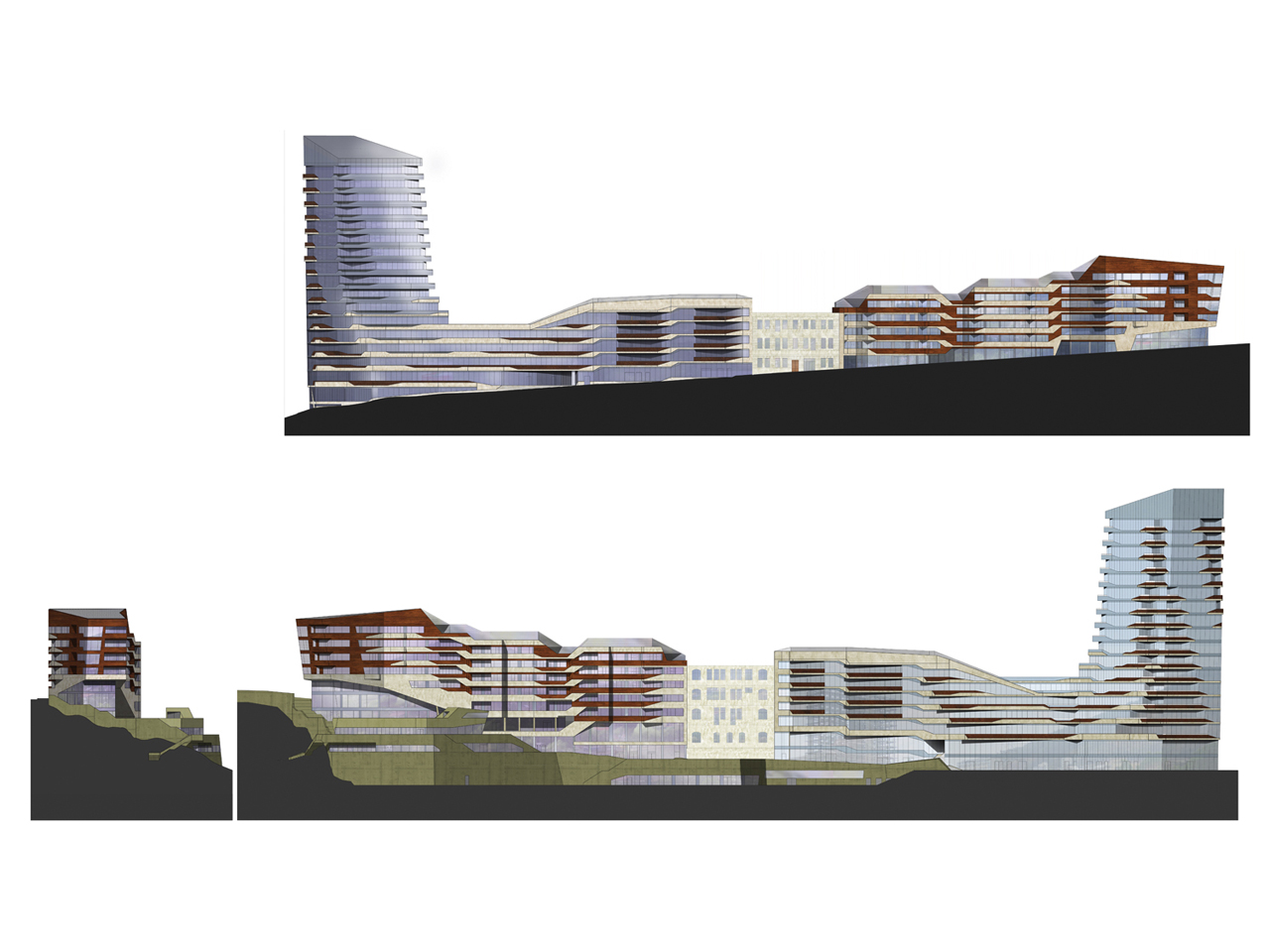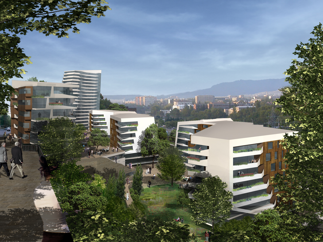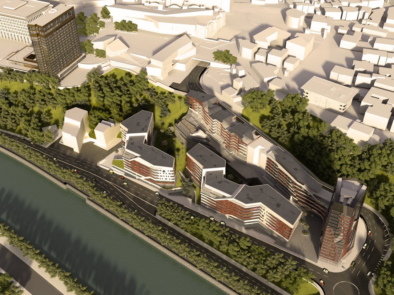 The proposal for a new residential quarter, located along the promenade of the Mtkvari River, below “Rose revolution Square”, the Heart of the city center of Tbilisi, is based on the main characteristics of the site which geologically derived from the historical situation of the estuary of a smaller river into the Mtkvari. The project arranges a new residential quarter in a differentiated mix of 311 apartments of various sizes in combination with high-quality retail areas on the lower floors, a small proportion of office areas as well as underground parking for apartments and shops. The landscaped character of the whole ensemble embeds the architecture in a natural way into the surrounding green zone and provides high-quality living in a green surrounding while being in the heart of the metropolis. The lower part of the development is split up into two meandering pieces thus becoming part of the new park and allowing views into and out of the area. The upper part of the ensemble develops along the slope of the terrain and re-stages the existing ‘Sakanela Road’ in terraced shapes, establishing ‘Sakanela Square’, the quarter’s own plaza, at its lower end. A high rise residential building on this side of the plot provides the new development with a landmark building, marking the end of Galaktioni Bridge. The high-rise provides apartments with stunning views to the lower areas of the city and the snow-capped mountains of the Caucasus in the background. The elegant silhouette of the high-rise swings along the street in a smooth torsion – away from neighbouring buildings and towards the river. The façade design for sakanela urban landscape brings about a subtle diversification of the building volumes, playing on the theme of the urban landscape with its mix of materials, the diversity of balcony and loggia situations and its manifold esthetic appearances.