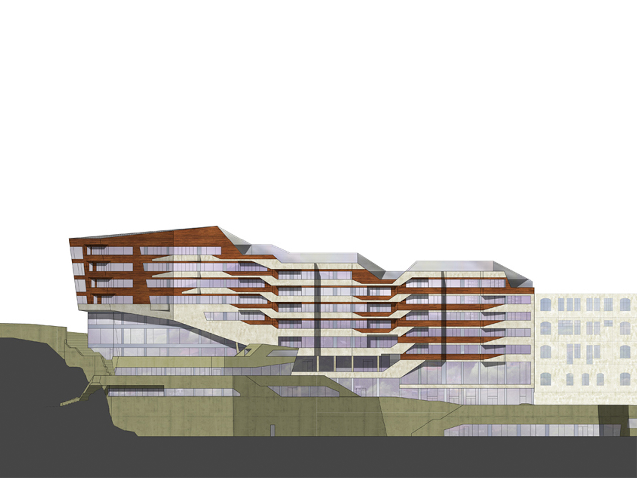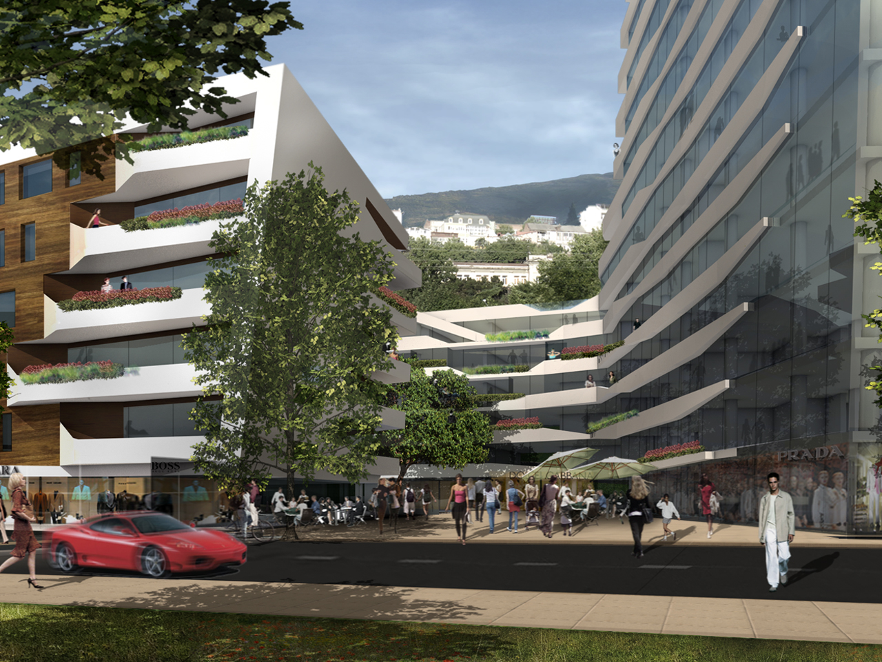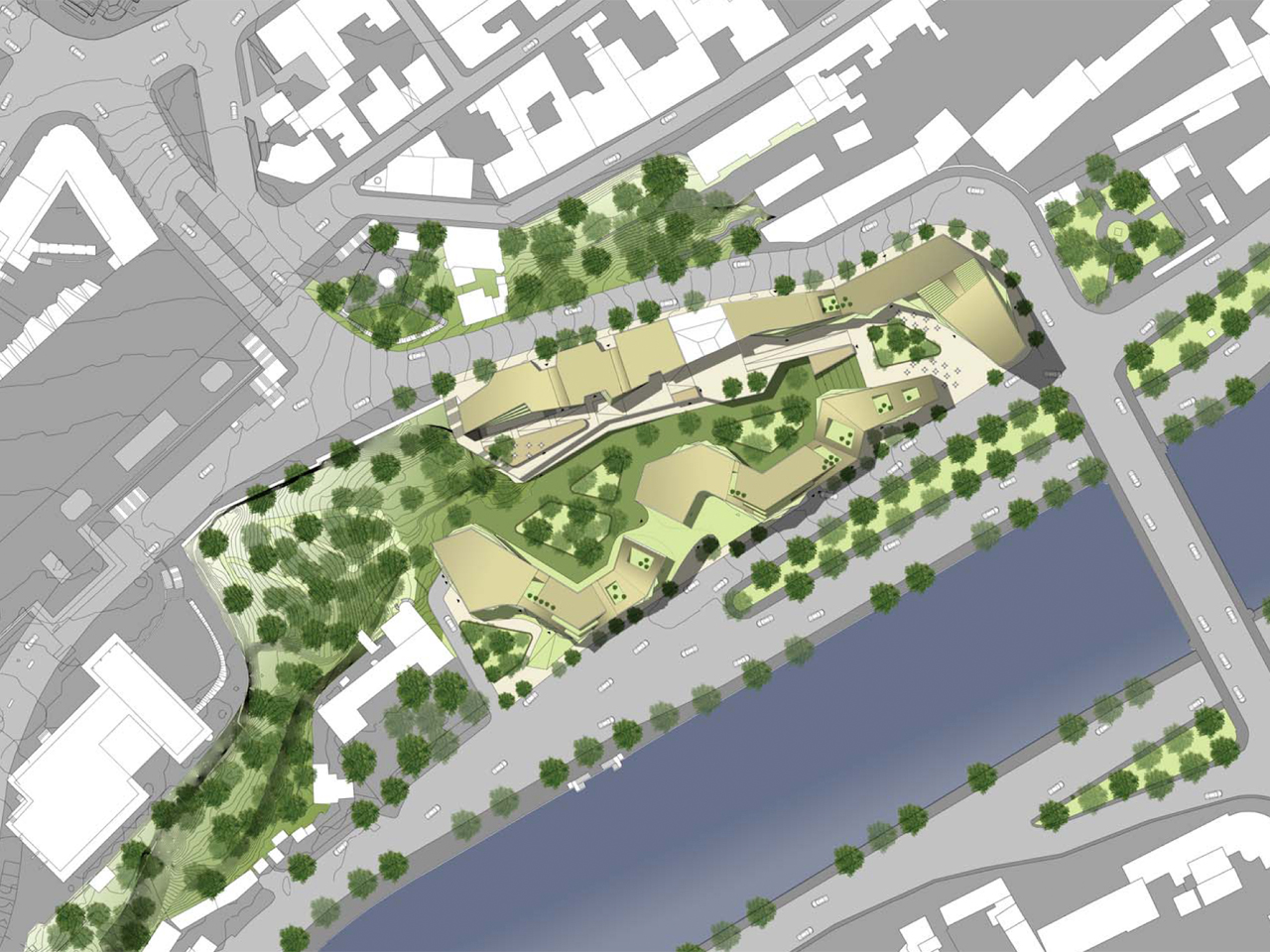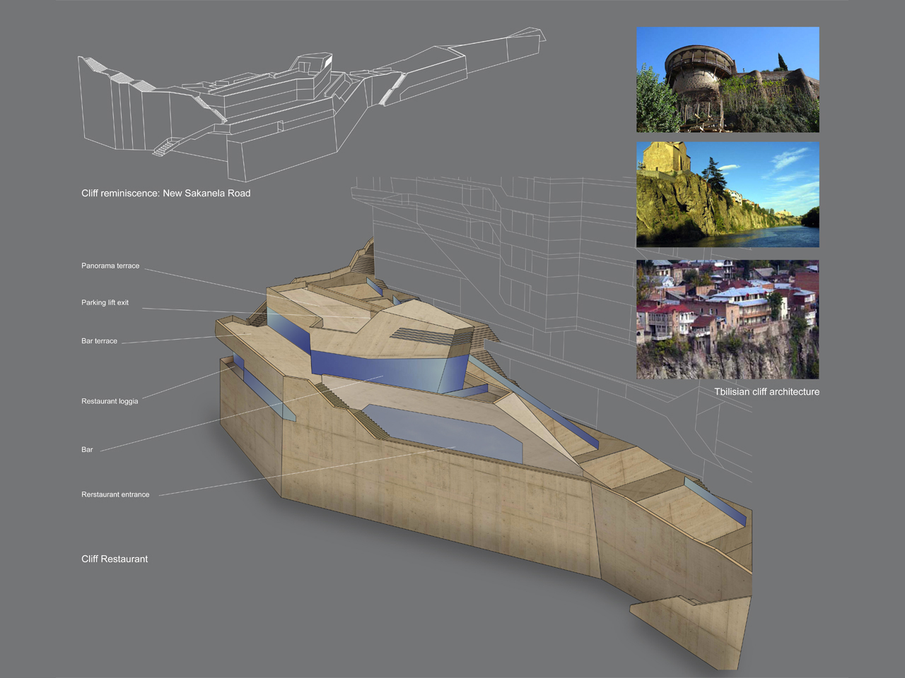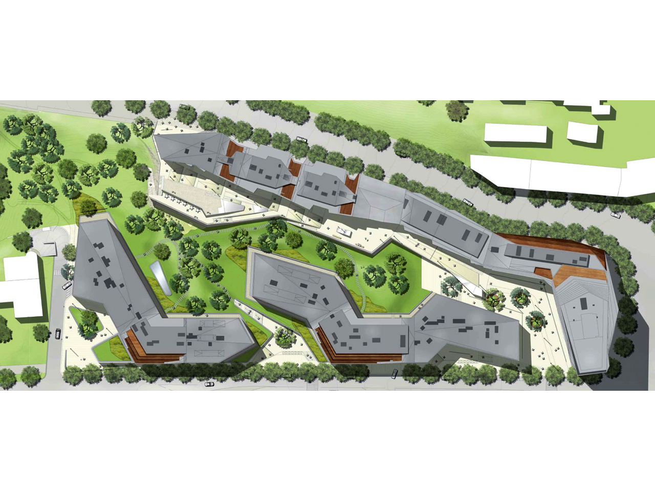 The proposal for a new residential quarter, located along the promenade of the Mtkvari River, below “Rose revolution Square”, the Heart of the city center of Tbilisi, is based on the main characteristics of the site which geologically derived from the historical situation of the estuary of a smaller river into the Mtkvari. The project arranges a new residential quarter in a differentiated mix of 311 apartments of various sizes in combination with high-quality retail areas on the lower floors, a small proportion of office areas as well as underground parking for apartments and shops. The landscaped character of the whole ensemble embeds the architecture in a natural way into the surrounding green zone and provides high-quality living in a green surrounding while being in the heart of the metropolis. The lower part of the development is split up into two meandering pieces thus becoming part of the new park and allowing views into and out of the area. The upper part of the ensemble develops along the slope of the terrain and re-stages the existing ‘Sakanela Road’ in terraced shapes, establishing ‘Sakanela Square’, the quarter’s own plaza, at its lower end. A high rise residential building on this side of the plot provides the new development with a landmark building, marking the end of Galaktioni Bridge. The high-rise provides apartments with stunning views to the lower areas of the city and the snow-capped mountains of the Caucasus in the background. The elegant silhouette of the high-rise swings along the street in a smooth torsion – away from neighbouring buildings and towards the river. The façade design for sakanela urban landscape brings about a subtle diversification of the building volumes, playing on the theme of the urban landscape with its mix of materials, the diversity of balcony and loggia situations and its manifold esthetic appearances.