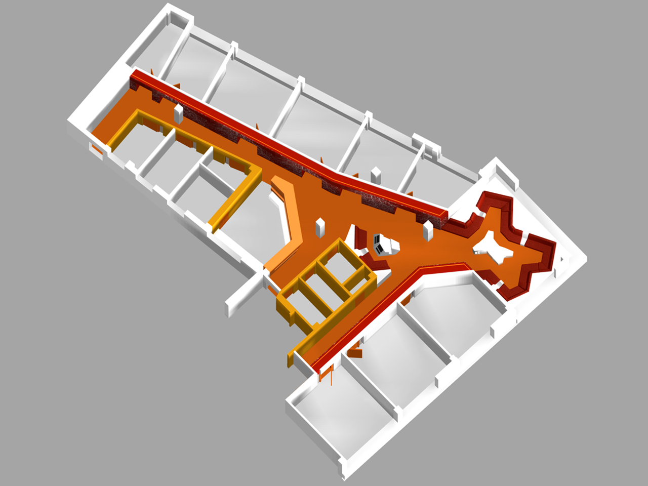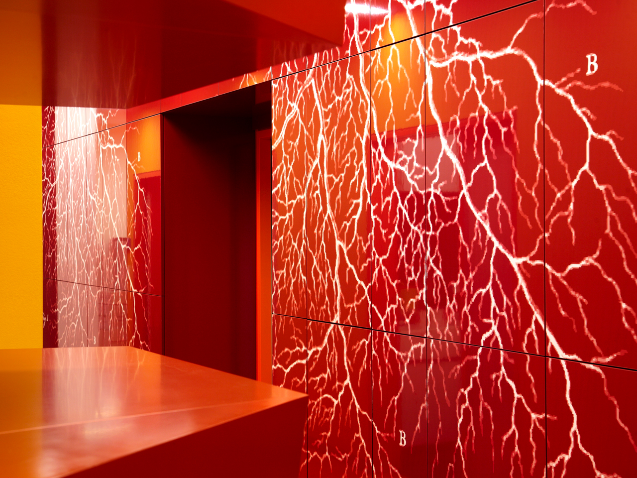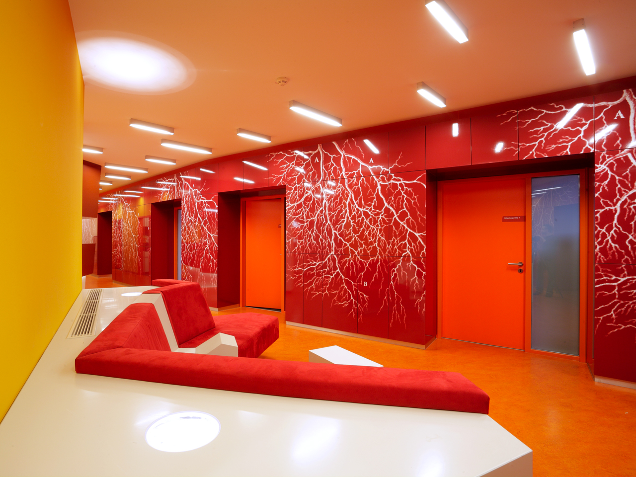 Das klassische Raumprogramm einer Arztpraxis wurde in ein neuartiges Raumkonzept umgesetzt: Die notwendigen Erschließungsflächen sind zu einem sich weitenden und verengenden Raumkontinuum zusammengefasst welches den Empfang, zwei Warte-, Sanitär- und Laborbereiche sowie das Patientenarchiv vereint. Letzteres wird vollständig in den 32 Meter langen, raumhohen, roten Einbauschränken aufgenommen. In der zweiseitig belichteten, hellen Gebäudeecke ist der Wartebereich als „Patientenlounge“ angeordnet. Hier finden die Schrankwände des Patientenarchivs ihre formale und farbliche Fortsetzung in der polygonalen, roten Sitzbank aus Veloursleder. Vis-a-vis ist der als körperhaftes Objekt ausgebildete, perl-orange lackierte Empfangstresen am Eingang angeordnet. Durch seine schräg verlaufenden Flächen und Kanten verstärkt er die Dynamik des gesamten Raumes. Hinter den roten Schrankwänden liegen entlang der beiden Außenfassaden die Sprechzimmer und Behandlungsräume. Die Fronten der Schrankwände sind mit einem speziell entworfenen und gefertigten Dekor belegt, welches auf einem historischen Kupferstich eines Venensystems beruht. Im Gegensatz zu den in Weiß und Grau gehaltenen Behandlungs- und Sprechzimmern wurde der Erschließungsbereich in einer freundlich anregenden, warmen Farbkomposition aus einem kräftigen Dunkelrot, einem hellen Gelb und verschiedenen Orangetönen gestaltet.