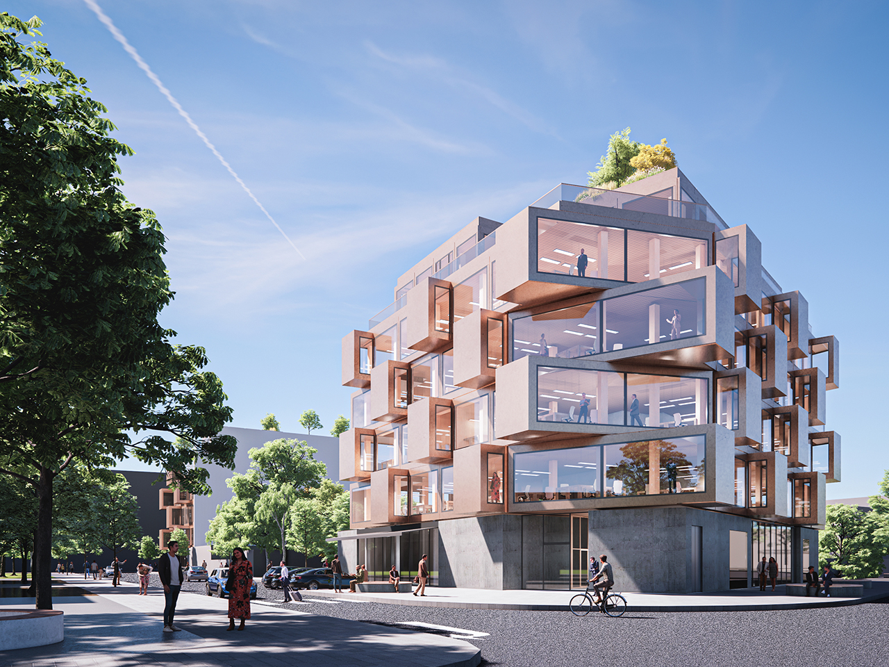 Beide Baukörper entstehen in Holz-Hybrid-Bauweise über einem Keller- und Sockelgeschoss in Stahlbetonweise. Sichtbare Holzoberflächen prägen auch die Innenräume, die sich über die zahlreichen Erker in den Stadtraum erweitern.