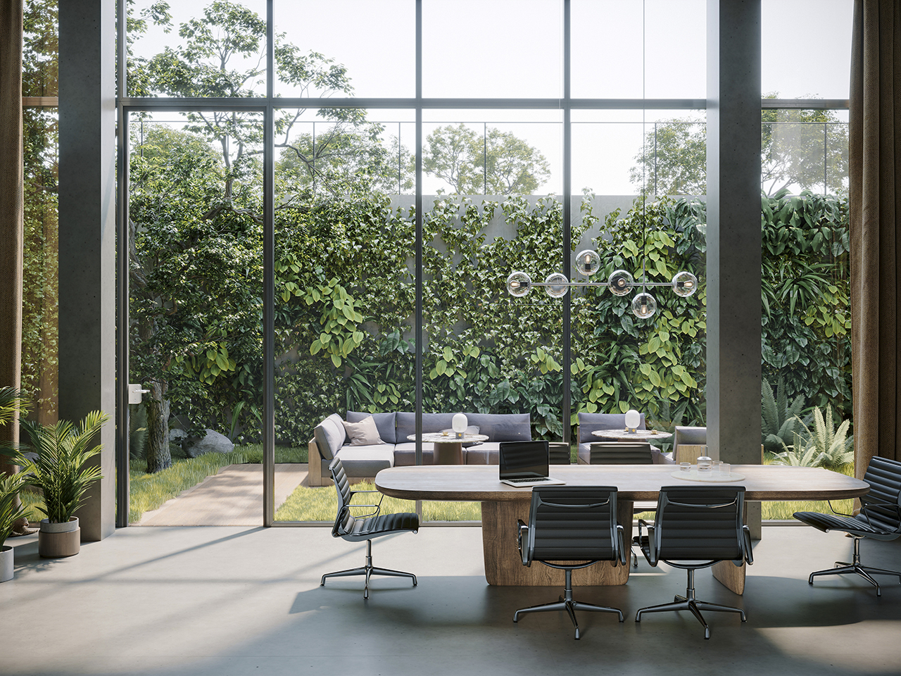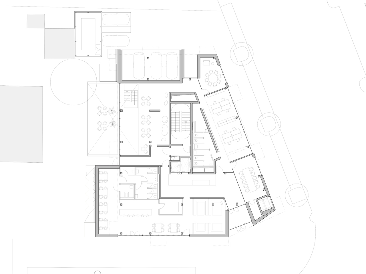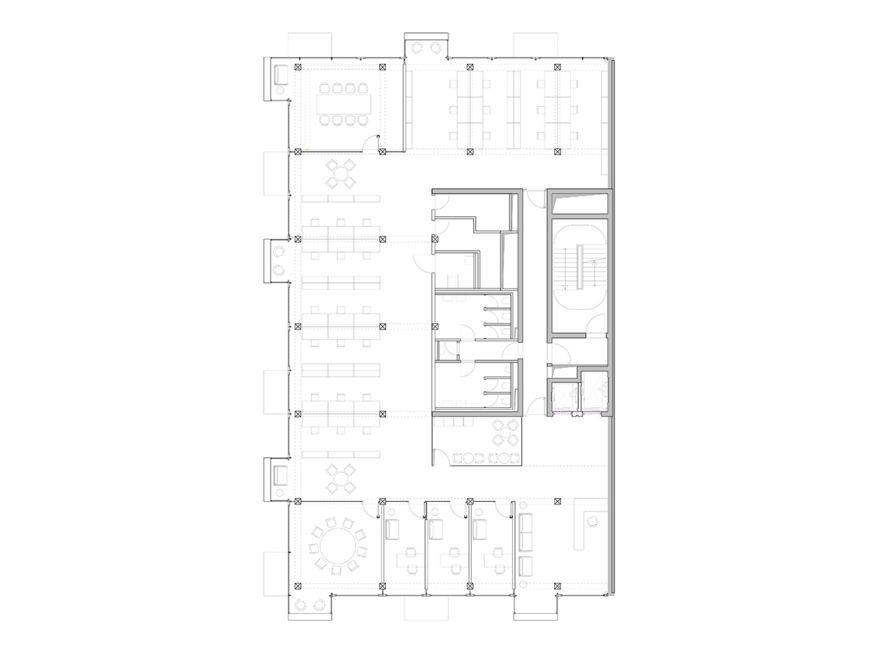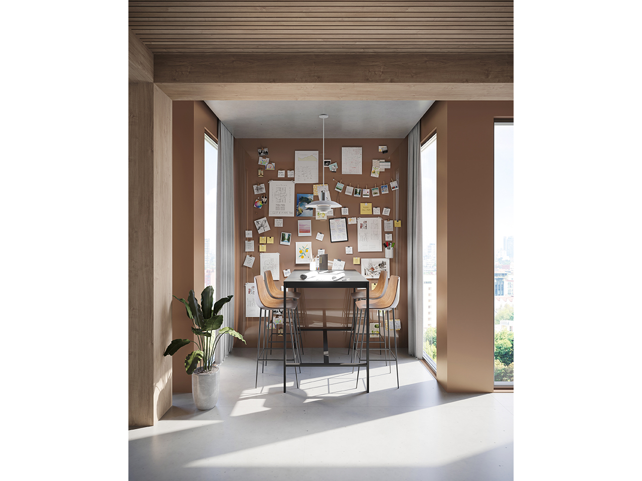 Zusätzlich zur Flexibilität und Veränderbarkeit der Grundrisse, wird die Fassade von innen nach außen erweitert, diese wird betretbar und als Grenze überwindbar. Zum Telefonieren, für eine Videokonferenz, ein schnelles informelles Meeting oder einfach als Break-out sind diese Ausbuchtungen ein idealer Ort und Kontrast zur offenen Raumlogik der Großraumbereiche.