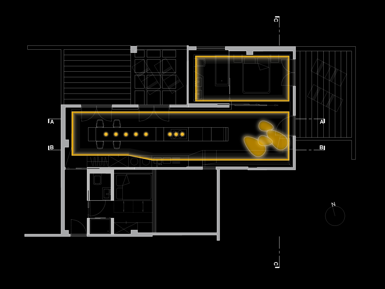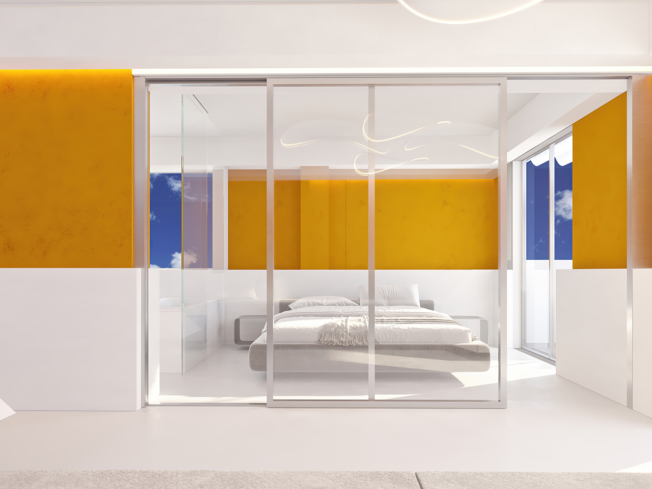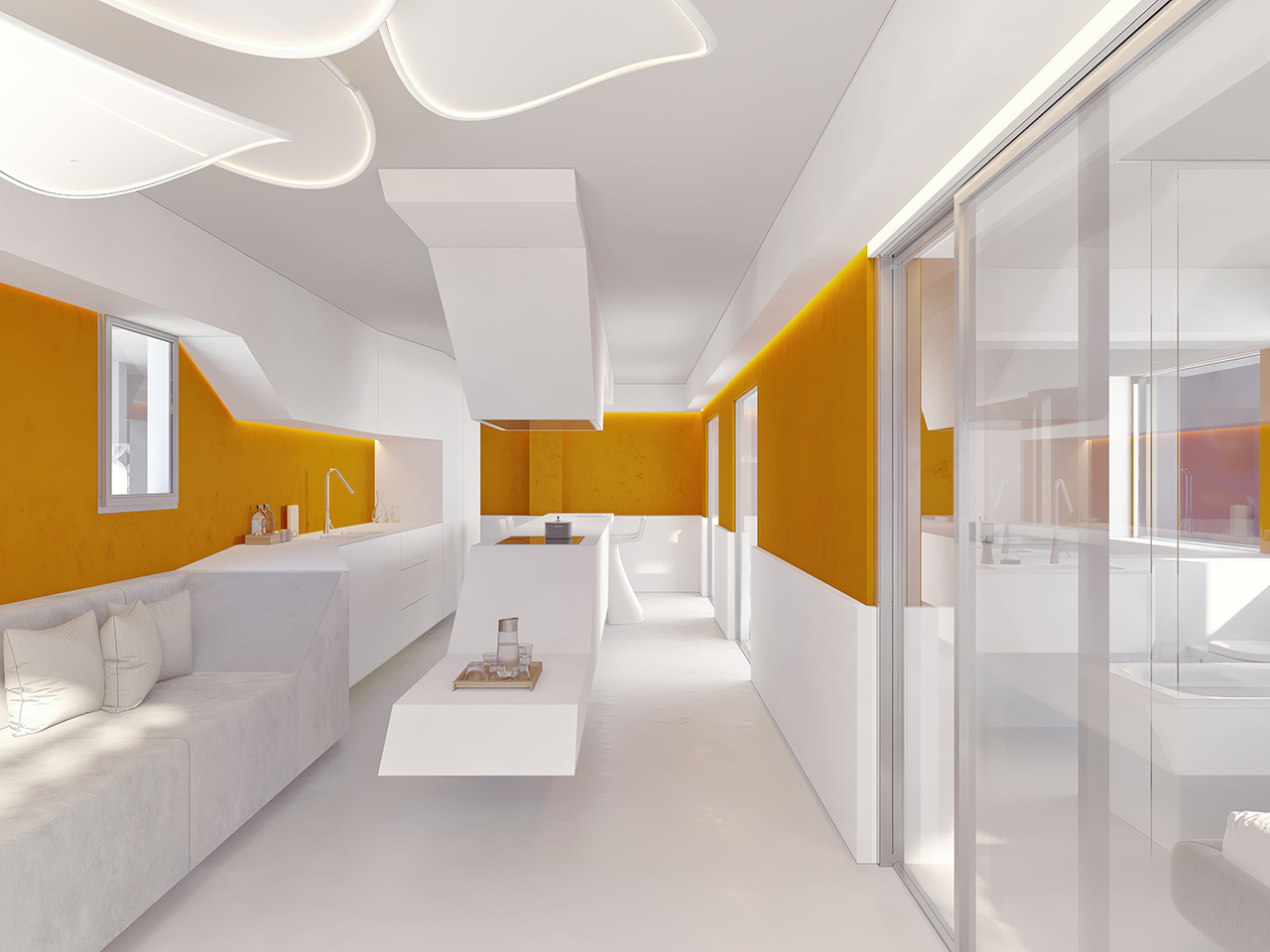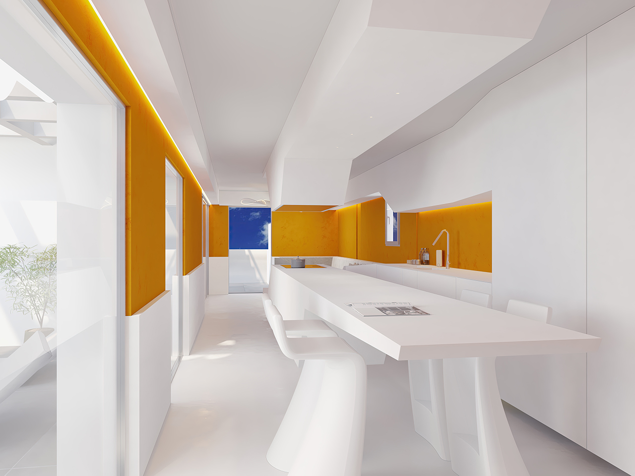 Der zentrale Wohnraum ist durch eine weiße, skulpturale Figur geprägt, die alle Funktionen integriert: Küche und Kochinsel mit Abzugshaube, Esstisch, Sofalandschaft sowie direkte und indirekte Beleuchtung. So entsteht ein kontinuierlich gefasster Raum mit vielfältigen Perspektiven, der eine zeitgemässe, mediterrane Atmosphäre schafft. Diese Atmosphäre wird unterstützt durch die umlaufende sonnengelbe Farbgebung der Wand, die mit dem Ausblick auf den blauen Himmel über Mallorca kontrastiert. Die umlaufende indirekte Beleuchtung wird durch Spots sowie eine Lichtskulptur ergänzt.
