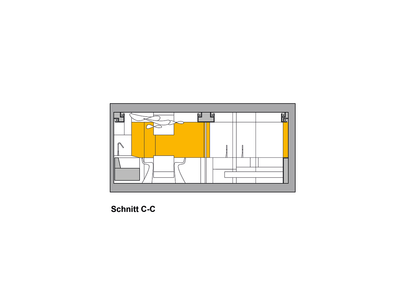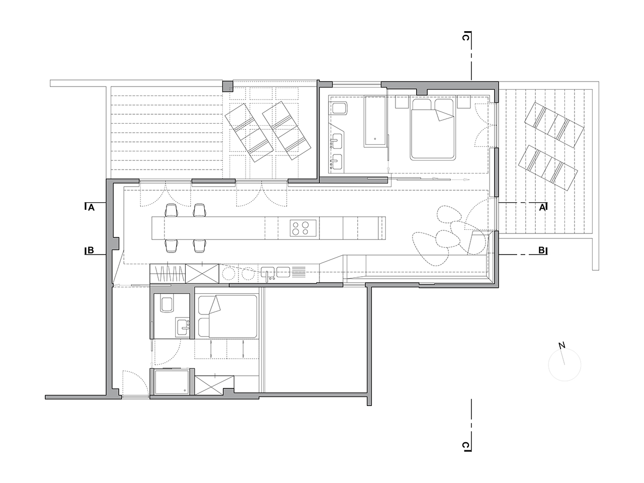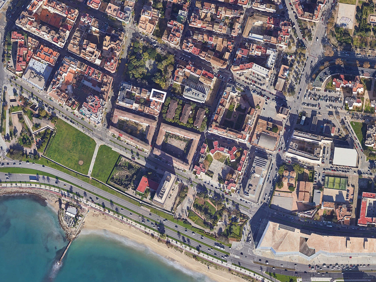 Für ein traditionelles Apartment im Stadtviertel Foners in Palma de Mallorca wurde ein Konzept für einen komplett neuen Innenausbau entwickelt. Die klassische Aufteilung von an einem Flur gelegenen Zimmern wurde aufgebrochen und stattdessen ein langgestreckter, zentraler Wohn- und Essbereich geschaffen, der damit an beide Terrassen anbindet und Lichteinfall und Blickbezüge über diese wie auch Zugang zu diesen ermöglicht. Das angrenzende und ebenfalls mit der östlichen Terrasse verbundene Schlafzimmer ist über eine Glasschiebewand vom Wohnraum abgetrennt, sodass eine großzügige Raumfolge entsteht. Das Bad wiederum hat eine offene Verbindung zum Schlafzimmer. Gewünschter Sichtschutz wird durch Vorhänge gewährleistet. Vom Eingangskorridor aus ist ein abgetrenntes Gästezimmer mit eigenem Bad erreichbar, das zu einem Lichthof hin orientiert ist.