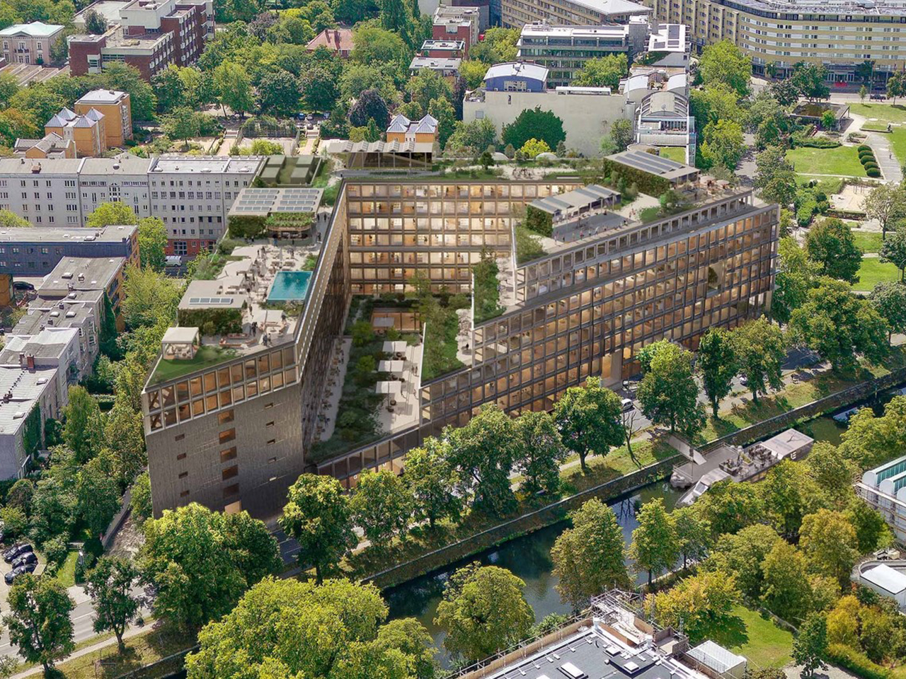 Das neue Bürogebäude schließt an den Hoteltrakt an und entwickelt sich in grenzständiger Bauweise bis zum Lützowufer. Die Blockfigur des historischen Dörnberg-Dreiecks wird wieder geschlossen und damit an den drei Seiten von Lützowstraße, Lützowplatz und Lützowufer klare Stadtkanten in Fortschreibung der angrenzenden Blockstrukturen ausgebildet. Gleichzeitig öffnet sich eine terrassenförmige Abstufung durch das neue Gebäudeensemble zum Landwehrkanal und schafft eine grüne Plaza mit begrünten Terrassen, Höfen und Dachflächen. Diese Landschaftsgestaltung verbindet den Baukörper mit dem öffentlichen Raum und ermöglicht Blickbeziehungen zum Wasser und zur Stadt. Gleichzeitig wird die lange Blockfront gegliedert und nimmt Bezug auf prägnante Nachbarbauten wie das Bauhausarchiv oder die Villa von der Heydt.