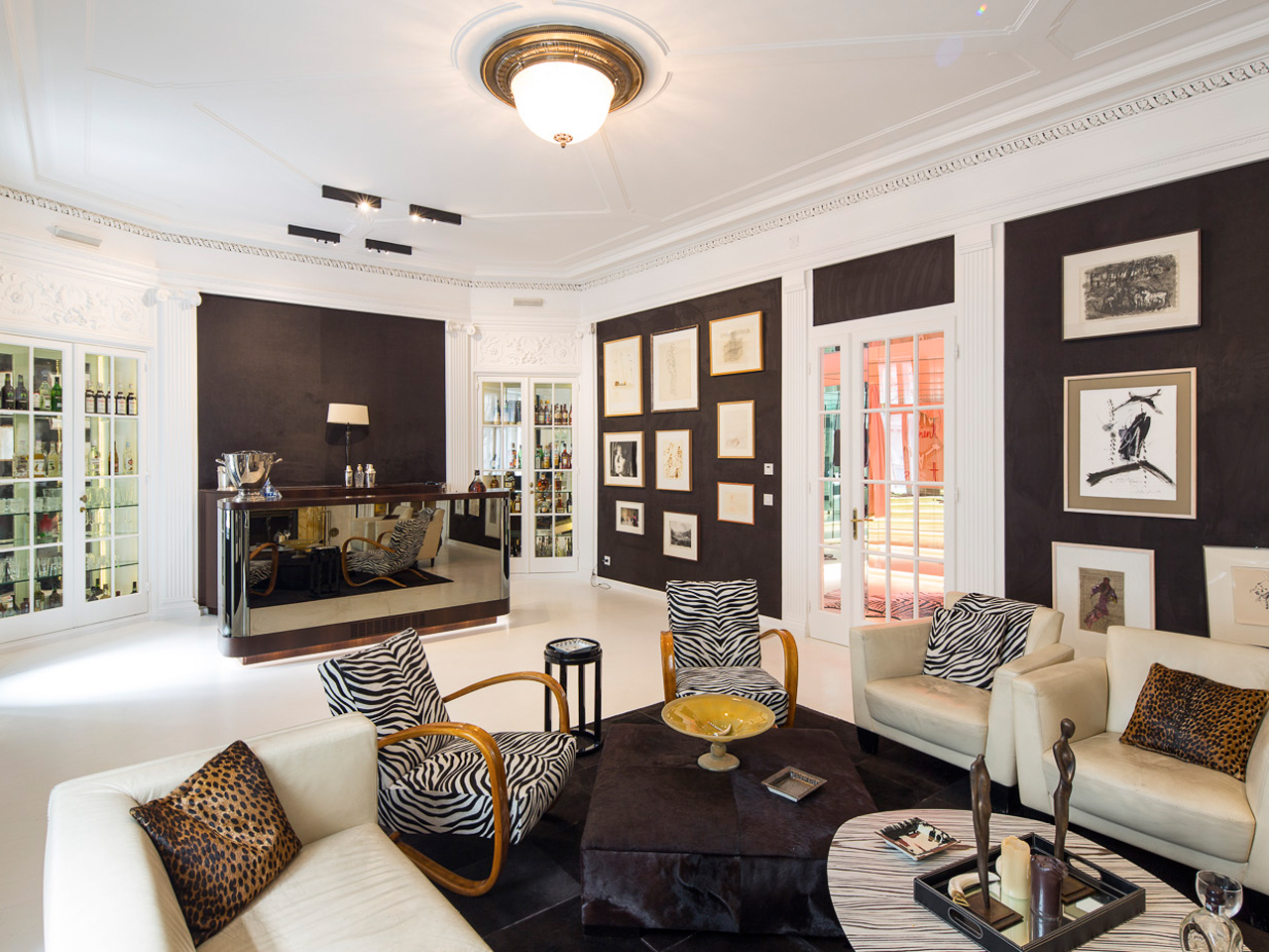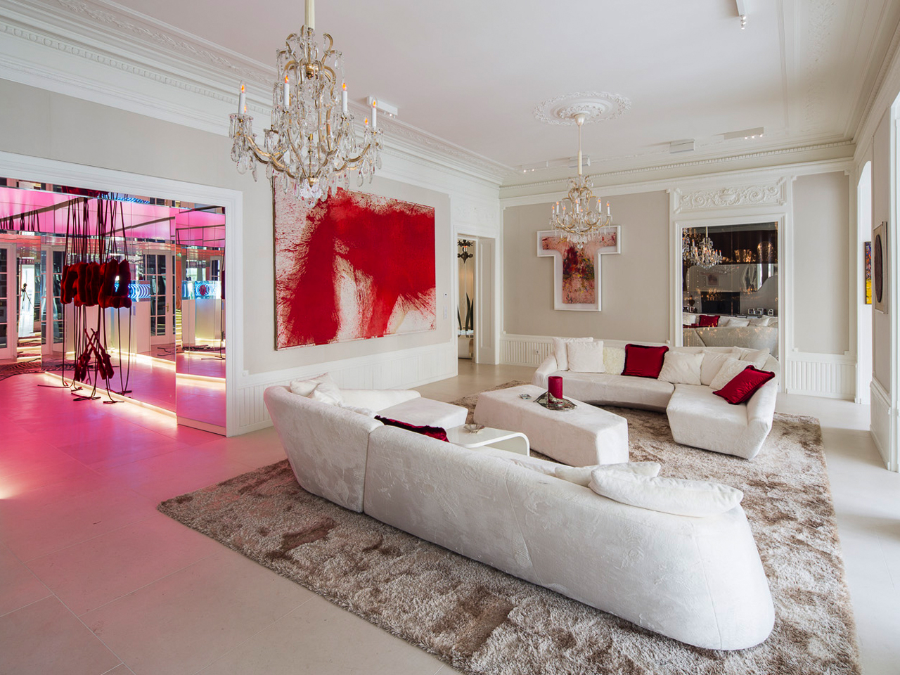 Das Interieur für das Erdgeschoß sowie einen orangerie-artigen Anbau einer alten Stadtvilla im dritten Wiener Bezirk wurde behutsam im Spannungsfeld zwischen alt und neu entwickelt. Foyer, Wohnraum und ein Galeriegang bilden einen Umgang, der primär in weiß gehalten ist und in dessen Mitte sich die alte zentrale Treppe befindet, die die Geschosse nicht mehr verbindet und zur Bibliothek ausgebaut wurde. Der Galeriegang ist auf beiden Seiten verspiegelt und multipliziert so die ausgestellte Kunst ins Vielfache. Aber nicht nur hier wurden Spiegel eingesetzt: Vom Foyer aus verbergen sich Garderobe und Gästetoilette hinter Spiegeln – im Bereich der Toilette ein Einwegspiegel, der den Blick ins Foyer erlaubt, ohne gesehen zu werden; die Verbindung zwischen Wohnraum und ehemaliger Loggia wird ebenfalls durch Spiegel geweitet. Vom Umgang in weiß aus erschließen sich die weiteren Räume wie Salon und Esszimmer wie Schatztruhen, in denen sich das Spiel von hellen Oberflächen in der Kombination mit dunklen Holzmöbeln und spiegelnden Flächen in Variationen zum Dunkleren hin fortsetzt. Zwischen Esszimmer und Wohnraum befindet sich im alten Durchgang eine Glasvitrine mit Silbergeschirr, die auf beiden Seiten von Einwegspiegeln begrenzt ist, sodaß man jeweils Einblick aber keinen Durchblick hat. Im Salon, in dem weiße Wände und weißer Boden mit schwarzem Tapetenflies kombiniert sind, ist in eine mit magic mirrors verspiegelte Bar der Fernseher integriert. In der Orangerie schließlich dominiert die in dunklem Wenge gebaute geschwungene Küche den Raum und setzt sich in Essbereich mit individuell entworfenem Esstisch und Grillkamin fort.