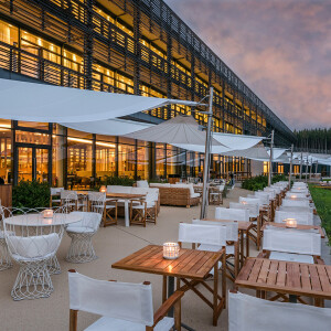 Man nähert sich dem Hotel durch einen dichten Eichenwald, ohne den See zu erahnen. In der Annäherung an das Gebäude fährt man zwischen begrünten Hügeln, über denen der zweigeschossige Riegel der Hotelzimmer schwebt. Unter dem Riegel und zwischen den Hügeln betritt man die Lobby, von der aus sich ein atemberaubender Blick über den See öffnet. Sämtliche Funktionseinheiten des Erdgeschosses (Restaurant, Veranstaltungsräume, Spa und Back-of-House) sind in die Hügellandschaft integriert, die mit der umgebenden Topographie sanft verschmilzt.