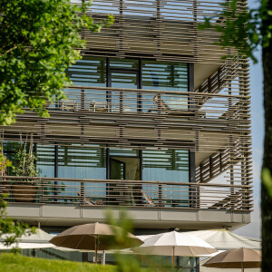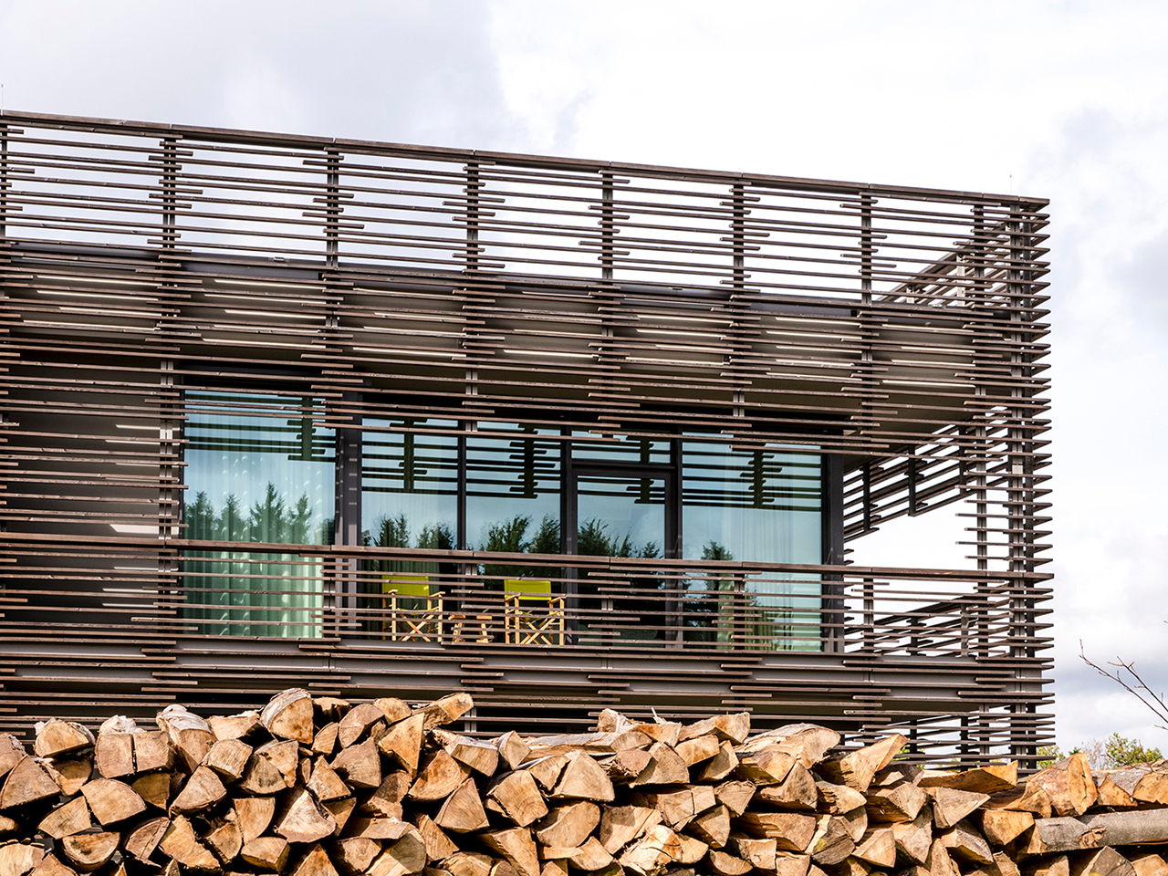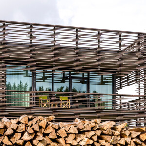 Das Gebäude ist in hochwertiger massiver Bauweise konzipiert. Die abgeholzten Bäume des freigelegten Westhanges verwandeln sich ideell in das „Kleid“ des Hauses und veranschaulichen so den Anspruch des Projektes nach Nachhaltigkeit: Die Fassade besteht aus Holzlamellen aus einheimischen Hölzern. So entsteht ein Haus aus der Kraft des Ortes, das seine Stärken nutzt und mit ihm in Harmonie eine neue Lebenswelt schafft, die nur hier entstehen kann und durch ihre eigene Identität eine Destination auszubilden vermag.
