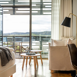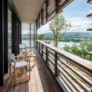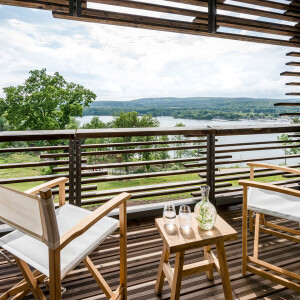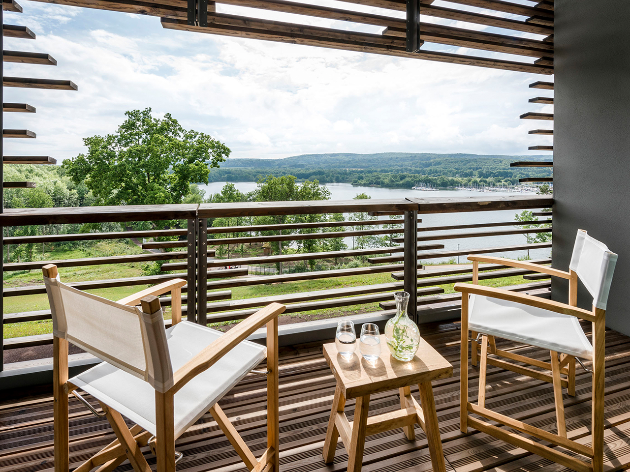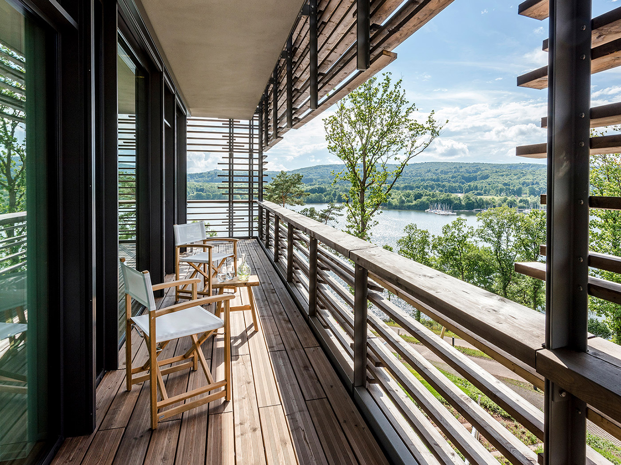 Von der Lobby gelangt man auch über Lifte direkt in die darüber gelegenen Zimmergeschosse, die in einem zweigeschossigen Zweispänner angeordnet sind, der so ausgerichtet ist, dass nahezu alle Zimmer einen Blick zum See haben: Auf der einen Seite nach Südwesten ausgerichtet, mit Blick in Richtung Sonnenuntergang und in die Tiefe des südlichen Teils des Sees; auf der anderen Seite nach Nordosten mit Morgensonne und Blick über die Wipfel der Bäume auf den nördlichen geweiteten Teil des Sees. Am nördlichen Kopfende sind Kopfsuiten angeordnet mit den spektakulärsten Blicken über das Kap und auf den See und an der Westseite in breiteren Achsfeldern gegenüber den Treppenhäusern befinden sich weitere Suiten.