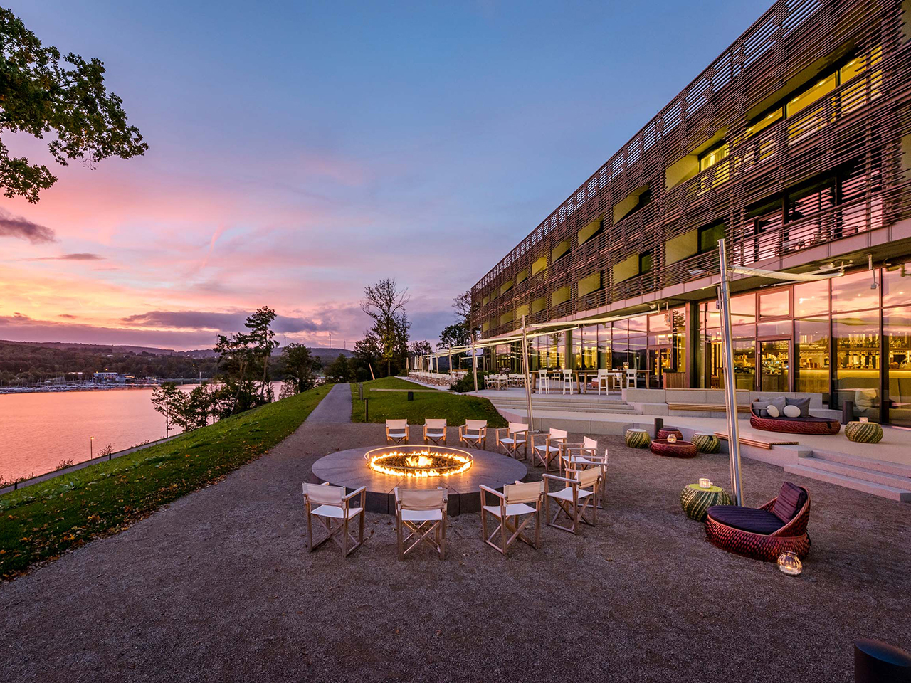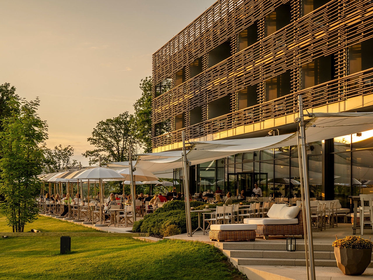 Die Spa- und Wellnesslandschaft kann sich zum Wald hin ausdehnen und bildet abgeschirmt von der Öffentlichkeit einzigartige räumliche Qualitäten aus. Die Hauptaktivitätszonen des Restaurants, des Veranstaltungs- und des Spa-Bereichs öffnen sich mit einem großen Einschnitt in die Landschaftshügel zum See hin und ermöglichen dadurch einen außergewöhnlichen Panoramablick. Lediglich der Westhang wird ausgedünnt und weitgehend von Bäumen befreit und bereitet damit dem Hotel einen unvergleichlichen Blick zum See und Sonnenuntergang.