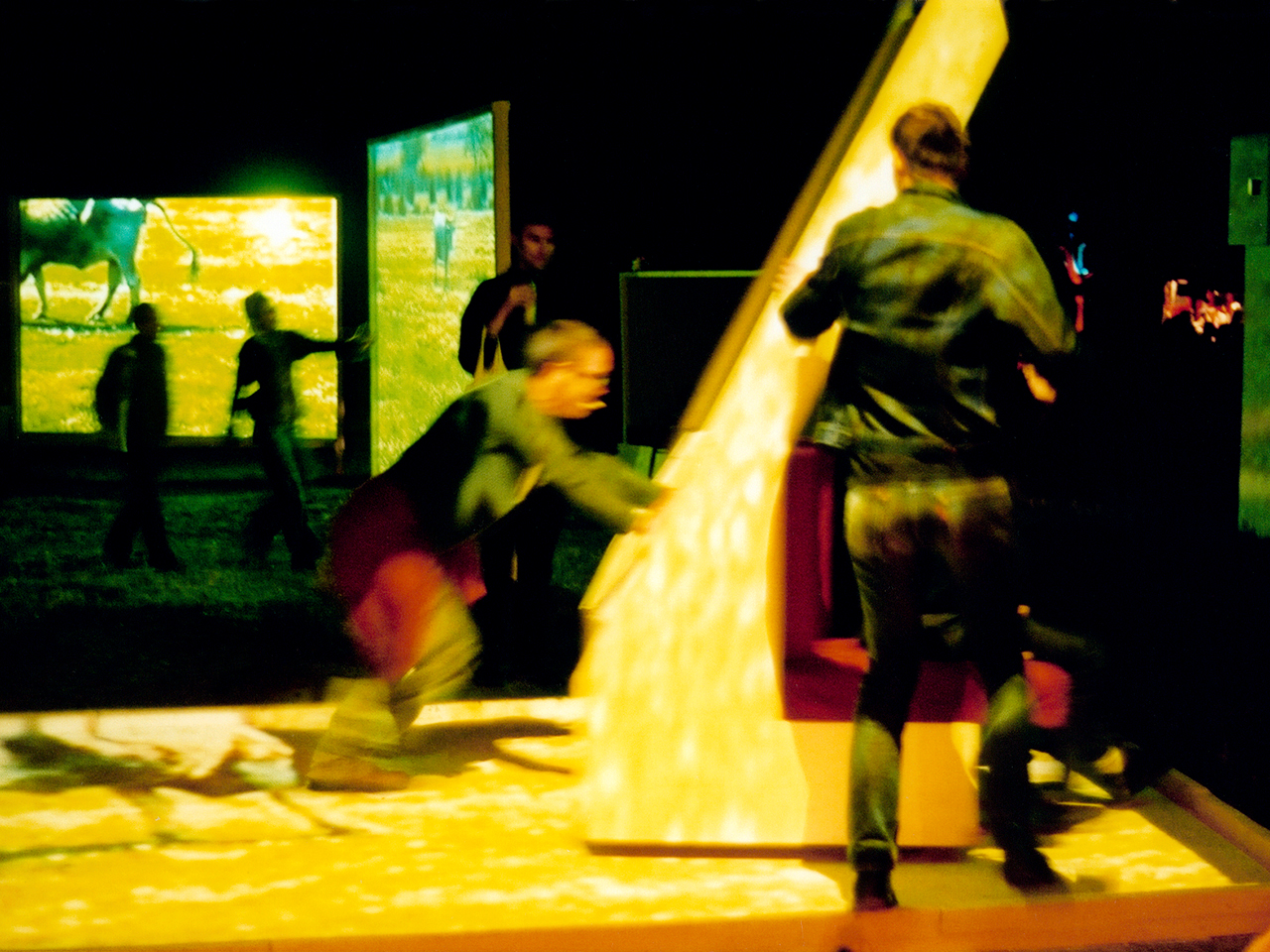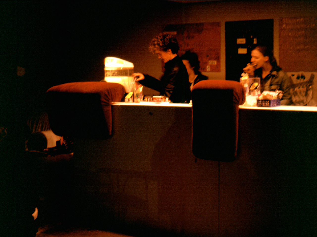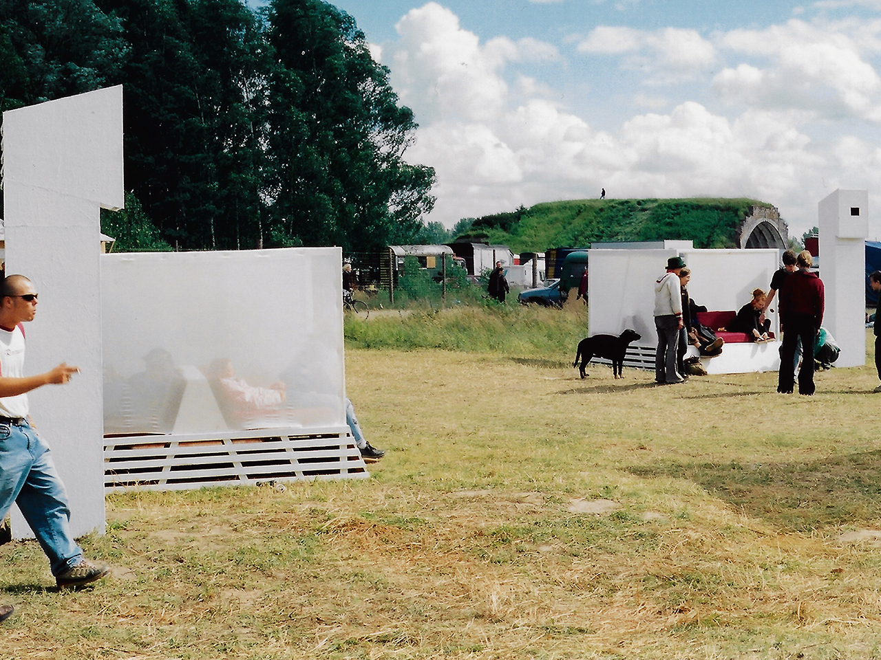 kinetour – ein Spiel mit Perspektiven und Bewegungen für den Kinohangar des Fusion-Festivals im Kulturkosmos Müritzsee. Für diese Installation wurden die drei wesentlichen Elemente des Kinos – Projektor, Leinwand und Kinosessel – für den Außenraum neu interpretiert und angeordnet, sodaß der Außenraum des Kinohangars zu einem Filmraum wurde, in dem der Besucher nicht unbeweglich am Platz verharrte, während die Filmkamera sich für ihn, sondern vielmehr er selbst sich durch vielfältige Perspektiven bewegte. Die Leinwände wurden von bed/u/ins flankiert – doppelseitige Kinoliegesessel mit einem Gazedach – die zum Verweilen einluden und eine Sicht auf die Leinwände wie auch auf das umgebende Gelände boten. Auf die drei Leinwände wurde Videomaterial projiziert, das von Moontan in Italien speziell für diesen Anlass aufgenommen wurde. Betrachter, die sich zwischen Leinwänden und bed/u/ins bewegten, warfen mit zunehmender Nähe zu den Leinwänden Schatten auf diese und wurden dadurch mit ihrem eigenen Körper in die Bildwelt der Filme einbezogen. Direkt vor dem Hangar befand sich eine kleine Bühnenfläche, auf die von oben unbewegte Bilder projiziert wurden, auf ihr befanden sich rollbare Sessel mit Projektionsflächen – auf denen sich Ausschnitte der Gesamtprojektion auswählen und verzerren liessen. Das Element der Kinobar wurde ebenfalls neu interpretiert: Die Bar war mit sensomaten angereichert – rote samtige Körper in unterschiedlichen Formen, die zum Anfassen und Anlehnen einluden. Als solche unterstützten sie die Kommunikation an der Bar, indem sie Räume der Intimität schafften, wenn man sich im Zwiegespräch über sie hinwegbeugte.