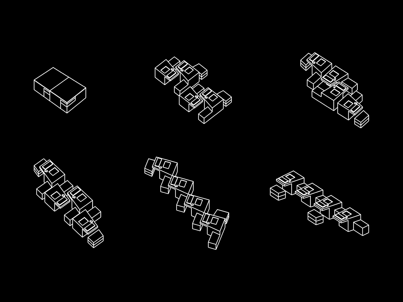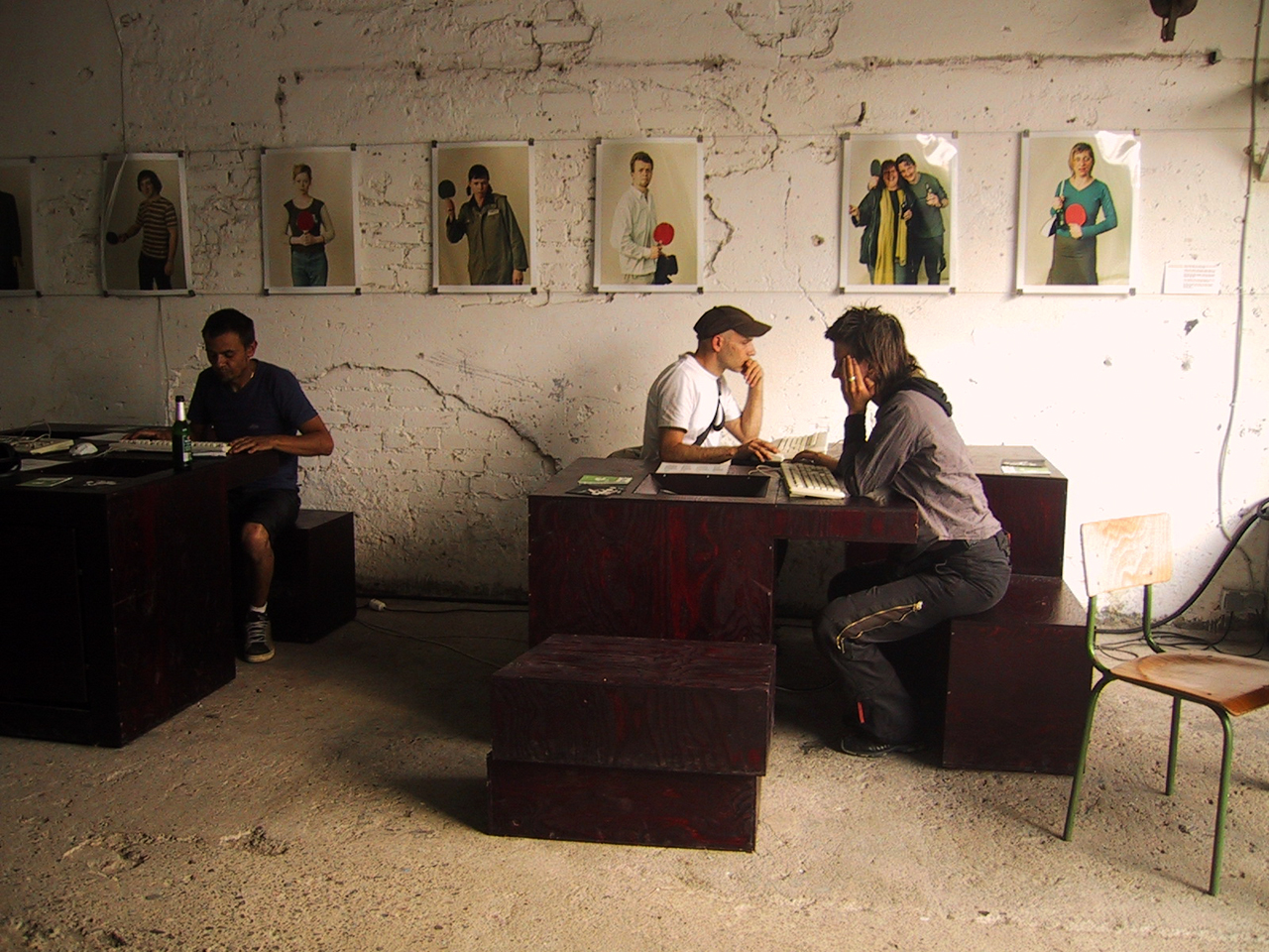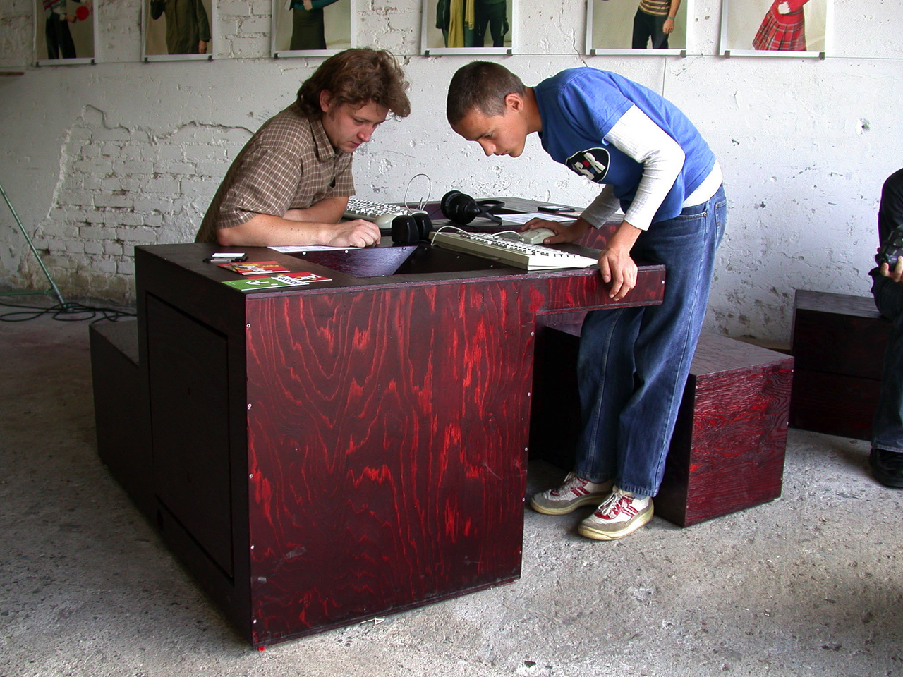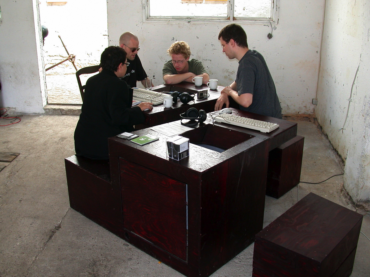 Die vier Computerterminals, die zum Thema playground für das Festival garage 2002 in Stralsund konzipiert und gebaut wurden, um eine Reihe von online-Projekten zu präsentieren, stellen ein avanciertes Holzspielzeug für Erwachsene dar. Als Bauklötze in einem Steckspiel ergeben sie in der entsprechenden Konstellation ein quaderförmiges Gesamt-volumen. Je nach Nutzung und Raumkonzept gibt es verschiedene Varianten der Anordnung: punktsymmetrisch oder aufgereiht oder in einer Kombination von beidem. Vier Elemente, die das Volumen komplettieren, ergeben zu je zweien einen Hocker, der je nach Anordnung die notwendigen Sitzmöglichkeiten ergänzt. Zusammengeschoben können die Terminals alternativ als Tisch gebraucht werden. Die Ausformung der Baukörper erlaubt trotz Konzentration im Spiel eine kommunikative Situation: Der gekippte Bildschirm ermöglicht eine Einsicht umstehender Zuschauer, die seitliche Sitzgelegenheit bietet Platz für ein Gegenüber des jeweiligen Nutzers mit Blick auf den Monitor. Die von Hand bearbeitete Oberfläche erzeugt eine real-sinnliche Komponente, die im Kontrast zum virtuellen Inhalt steht und die Präsenz im realen Raum unterstützt.